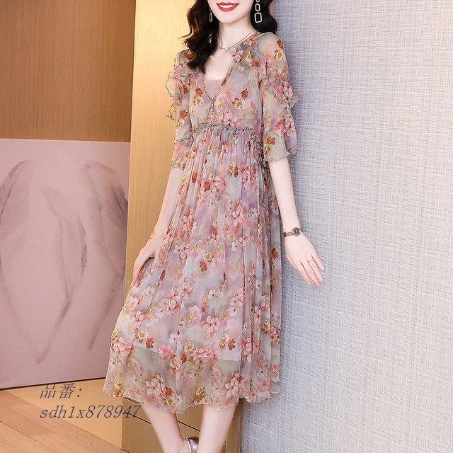 特別セール品 代 夏コーデ 夏 新作 レディース フェミニン ワンピース 花柄 レディース 上品 2color ワンピース フェミニン 華やか 2color 五分袖 フリル 夏ワンピ 夏服 レトロ 上品 Vネック シフォン ミモレ丈 華やか ロング丈 花柄 ワンピース チュニック